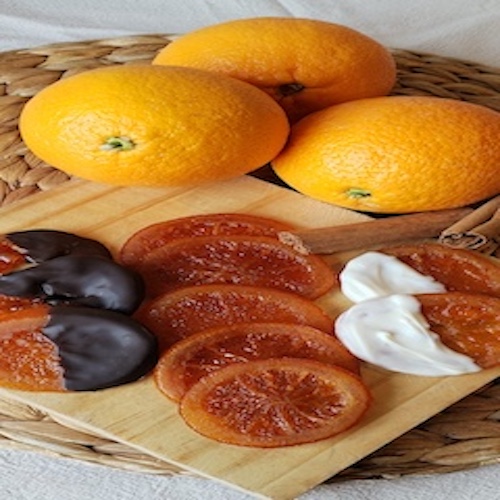 • 4 pzas naranjas de jugo lavadas y laminadas en grosor de entre 0,5 y 1 cm Puedes también, usar solo la cáscara en tiras